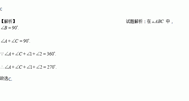 如图所示,已知△ABC为直角三角形,∠B=90°,若沿图中虚线剪去∠B,则∠1+∠2等于( )