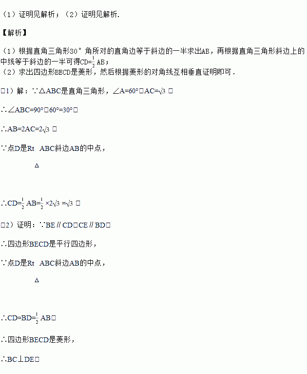 如图,点D是Rt△ABC斜边AB的中点,过点B、C分别作BE∥CD,CE∥BD.
