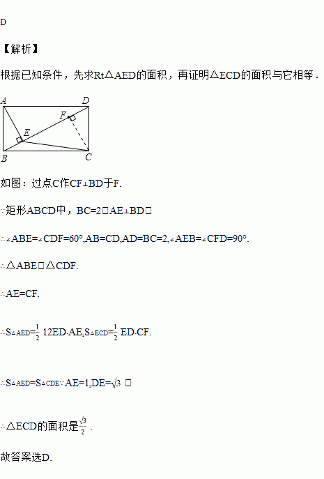 如图,在矩形ABCD中,BC=2,AE⊥BD,垂足为E,∠BAE=30°,那么△ECD的面积是 ( )