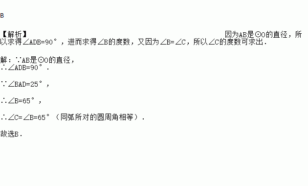 已知,如图,AB是⊙O的直径,点D,C在⊙O上,连接AD、BD、DC、AC,如果∠BAD=25°,那么∠C的度数是( )