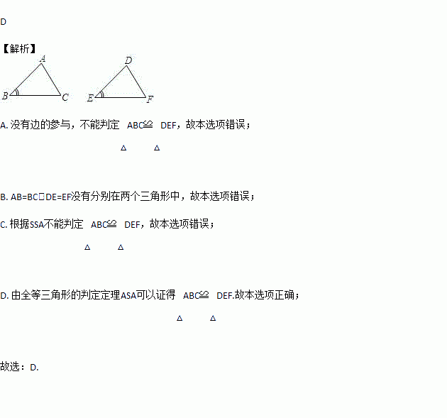 下列条件能判定△ABC≌△DEF的是 ( )