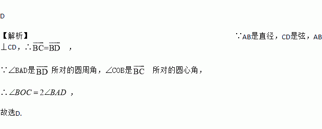 D 【解析】∵AB是直径,CD是弦,AB⊥CD,∴ , ∵∠BAD是所对的圆周角,∠COB是 所对的圆心角, ∴, 故选D.