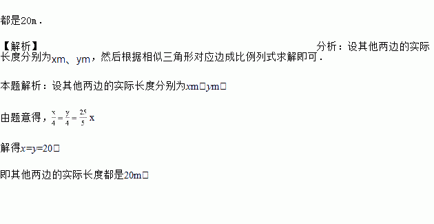 有一块三角形的草地,它的一条边长为25m.在图纸上,这条边的长为5cm,其他两条边的长都为4cm,求其他两边的实际长度