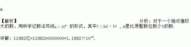 据报道2018年前4月,50城市土地出让金合计达到11882亿,比2017年同期的7984亿上涨幅度达到48.8%.其中数值11882亿可用科学计数法表示为( )