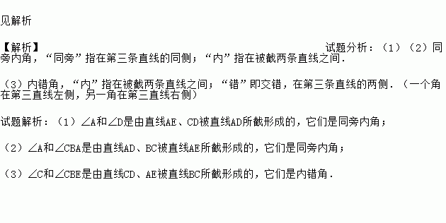 如图,BE是AB的延长线,指出下面各组中的两个角是由哪两条直线被哪一条直线所截形成的?它们是什么角?