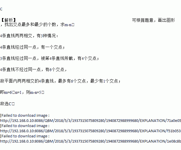 平面内有两两相交的4条直线,如果最多有m个交点,最少有n个交点,那么m-n= ( )