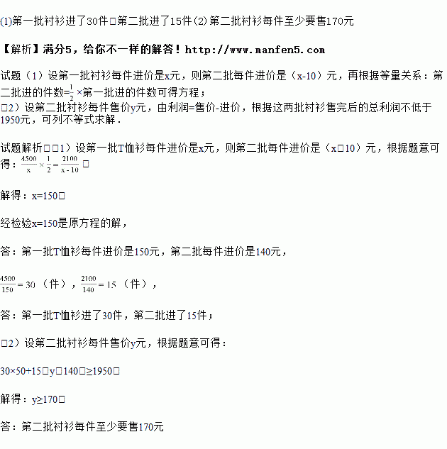 某服装店用4 500元购进一批衬衫,很快售完,服装店老板又用2 100元购进第二批该款式的衬衫,进货量是第一次的一半,但进价每件比第一批降低了10元.
