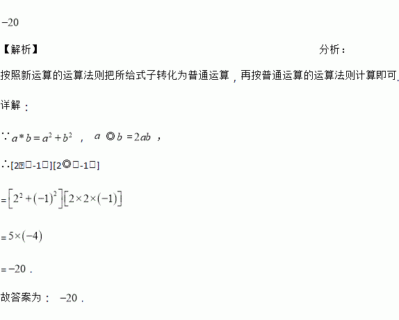现在规定两种新的运算“﹡”和“◎”:a﹡b=;a◎b=2ab,如(2﹡3)(2◎3)=(22+32)(2×2×3)=156,则[2﹡(-1)][2◎(-1)]=__________.
