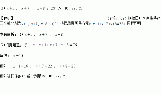 (2)在(1)中被框住的4个数之和等于76时,则被框住的4个数分别是多少?