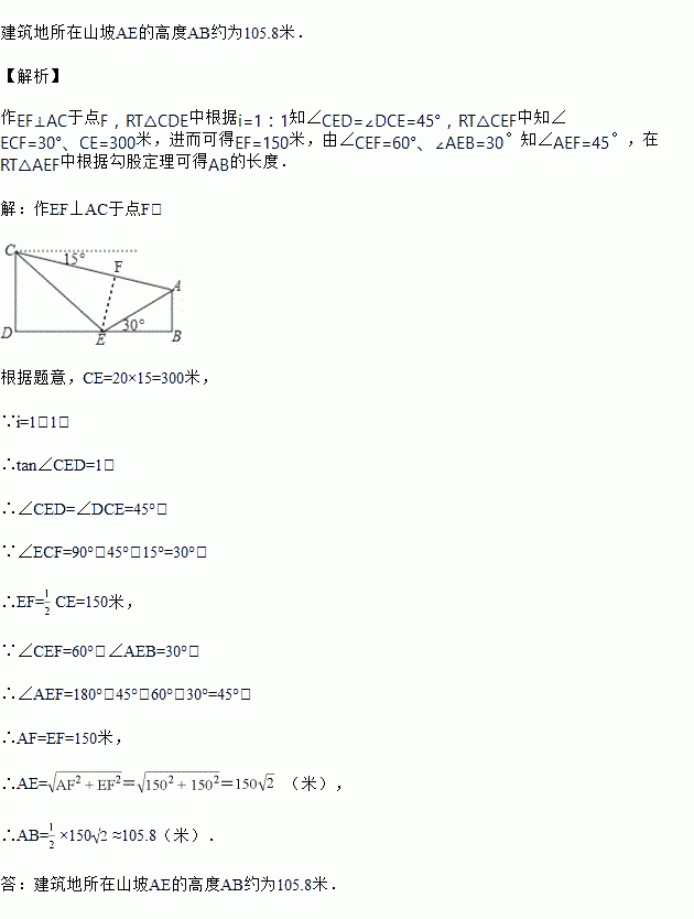 如图,活动课上,小玥想要利用所学的数学知识测量某个建筑地所在山坡AE的高度,她先在山脚下的点E处测得山顶A的仰角是30°,然后,她沿着坡度i=1:1的斜坡按速度20米/分步行15分钟到达C处,此时,测得点A的俯角是15°.图中点A、B、E、D、C在同一平面内,且点D、E、B在同一水平直线上,求出建筑地所在山坡AE的高度AB.(精确到0.1米,参考数据: