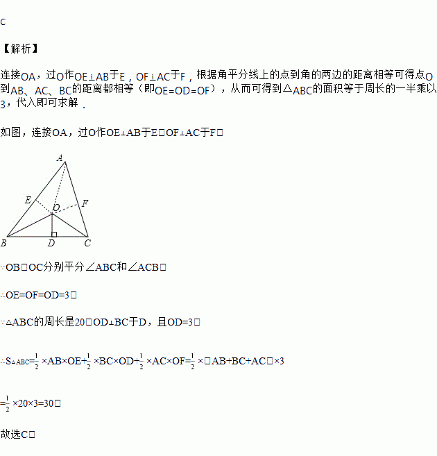 如图,已知△ABC的周长是20,OB和OC分别平分∠ABC和∠ACB,OD⊥BC于点D,且OD=3,则△ABC的面积是( )