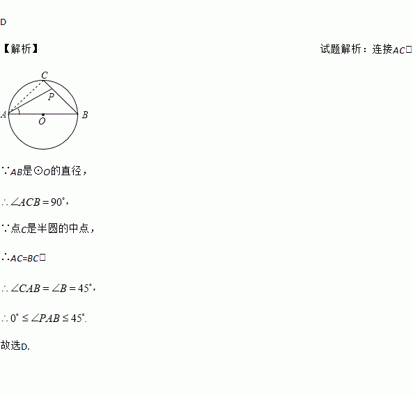 D 【解析】试题解析:连接AC, ∵AB是⊙O的直径, ∵点C是半圆的中点, ∴AC=BC, 故选D.