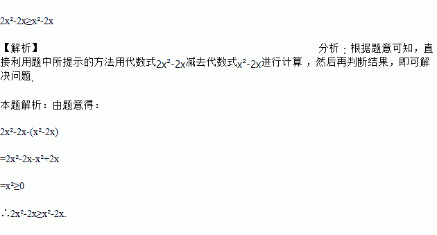 根据等式和不等式的基本性质,我们可以得到比较两个数大小的方法:若A-B>0,则A>B;若A-B=0,则A=B;若A-B<0,则A<B,这种比较大小的方法称为“作差比较法”,试比较2x2-2x与x2-2x的大小.