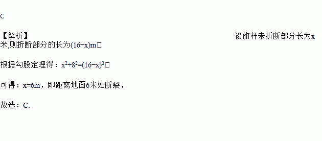 如图所示,台风过后某小学的旗杆在B处断裂,旗杆顶部A落在离旗杆底部C点8米处,已知旗杆长16米,则旗杆断裂的地方距底部( )