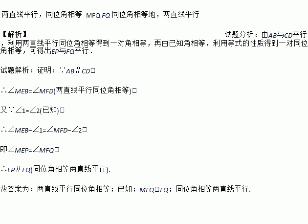 如图,已知AB∥CD,∠1=∠2,试说明EP∥FQ.