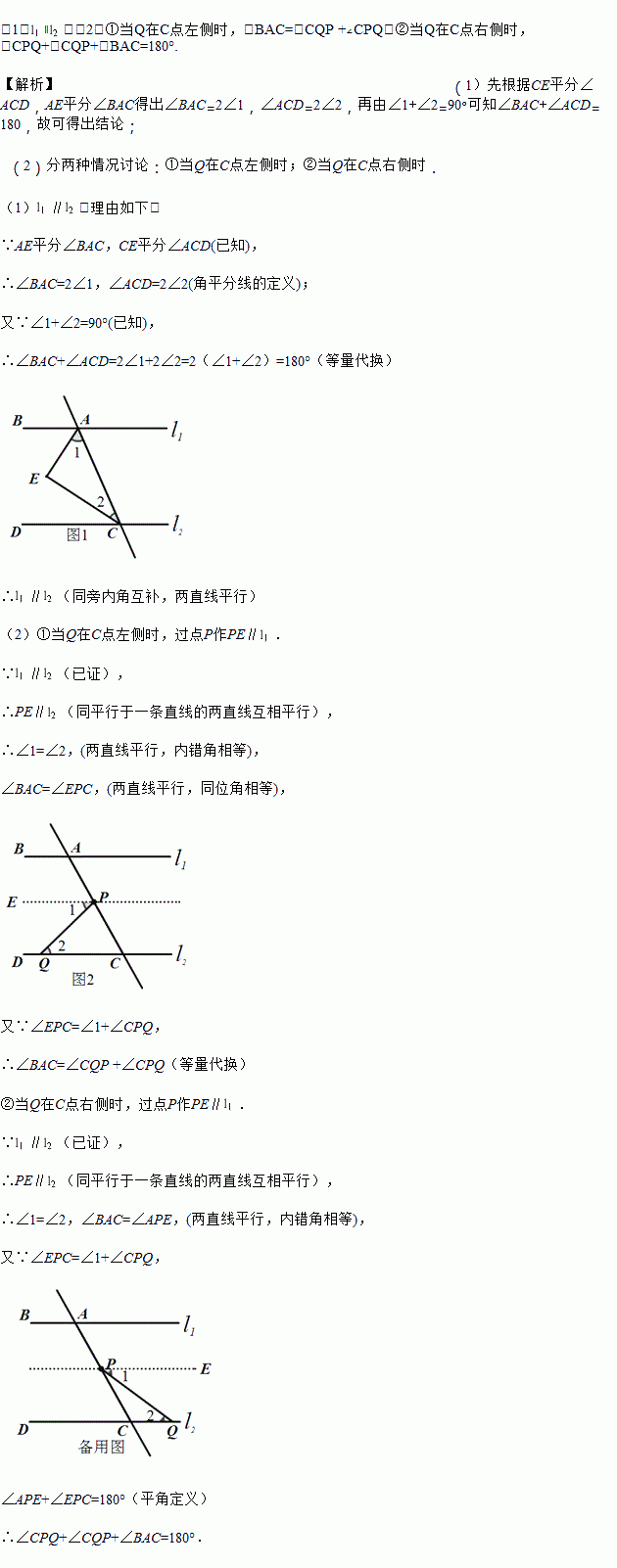 (2)如图2,在(1)的结论下,P为线段AC上一定点,点Q为直线CD上一动点,当点Q在射线CD上运动时(不与点C重合)∠CPQ+∠CQP与∠BAC有何数量关系?请说明理由.