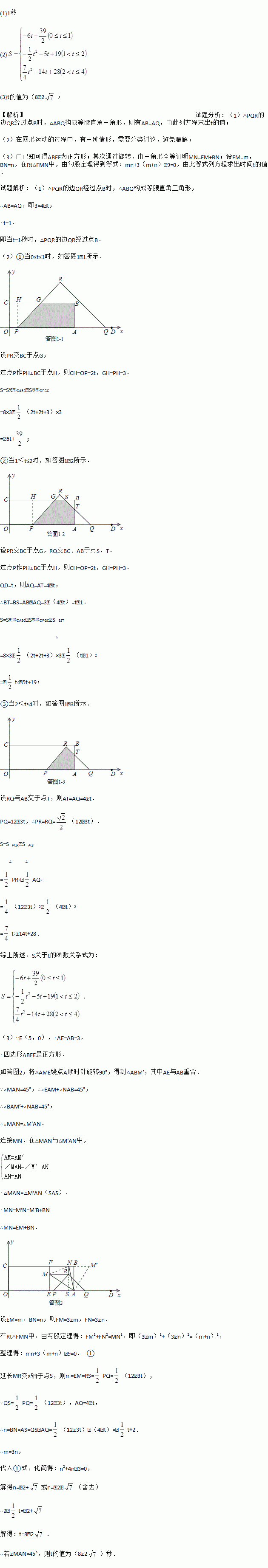 £¨3£©Èçͼ2£¬¹ý¶¨µãE£¨5£¬0£©×÷EF¡ÍBC£¬´¹×ãΪF£¬µ±¡÷PQRµÄ¶¥µãRÂäÔÚ¾ØÐÎOABCµÄÄÚ²¿Ê±£¬¹ýµãR×÷xÖá¡¢yÖáµÄƽÐÐÏߣ¬·Ö±ð½»EF¡¢BCÓÚµãM¡¢N£¬Èô¡ÏMAN=45¡ã£¬ÇótµÄÖµ£®