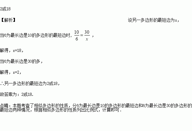 两个相似多边形的最长边分别是10和30,其中一多边形的最短边为6,则另一多边形的最短边为_________