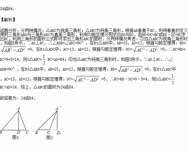 △ABC中,AB=15,AC=13,高AD=12.则△ABC的面积为 .