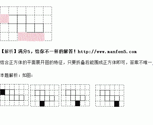 马小虎准备制作一个封闭的正方体盒子,他先用5个大小一样的正方形制成如图所示的拼接图形(实线部分),经折叠后发现还少一个面,请你在图中的拼接图形上再接一个正方形,使新拼接成的图形经过折叠后能成为一个封闭的正方体盒子(添加所有符合要求的正方形,添加的正方形用阴影表示)_____.