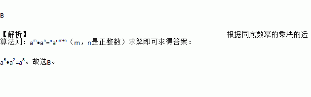 B 【解析】根据同底数幂的乘法的运算法则:am•an="a"m+n(m,n是正整数)求解即可求得答案: a6•a2=a8。故选B。