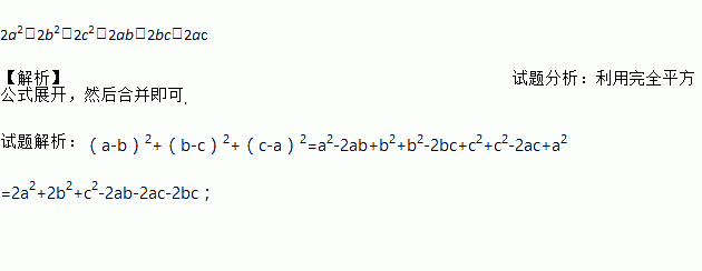 2a2+2b2+2c2-2ab-2bc-2ac 【解析】试题分析:利用完全平方公式展开,然后合并即可. 试题解析:(a-b)2+(b-c)2+(c-a)2=a2-2ab+b2+b2-2bc+c2+c2-2ac+a2 =2a2+2b2+c2-2ab-2ac-2bc;