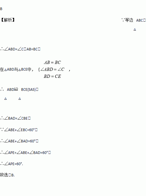 如图,等边△ABC中,BD=CE,AD与BE相交于点P,则∠APE的度数是( )