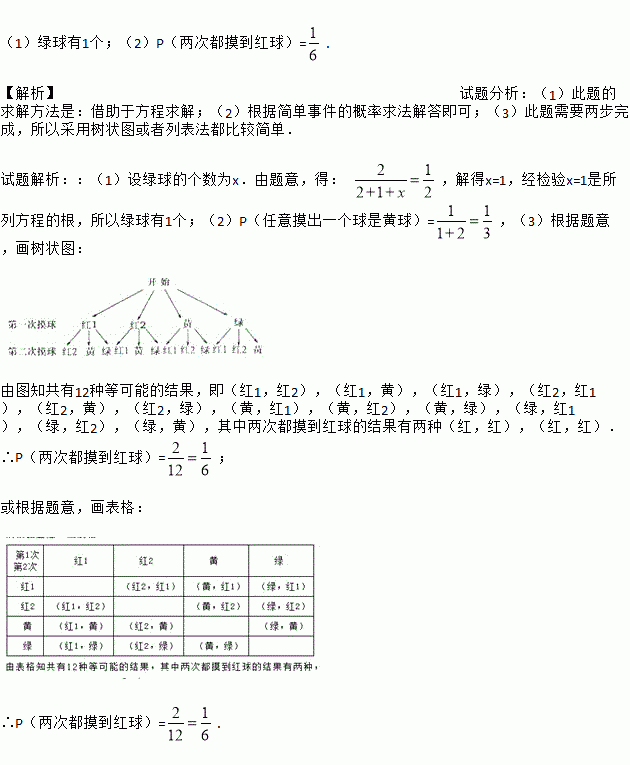 (1)绿球有1个;(2)P(两次都摸到红球)=. 【解析】试题分析:(1)此题的求解方法是:借助于方程求解;(2)根据简单事件的概率求法解答即可;(3)此题需要两步完成,所以采用树状图或者列表法都比较简单. 试题解析::(1)设绿球的个数为x.由题意,得: ,解得x=1,经检验x=1是所列方程的根,所以绿球有1个;(2)P(任意摸出一个球是黄球)=,(3)根据题意,画树状图: 由...