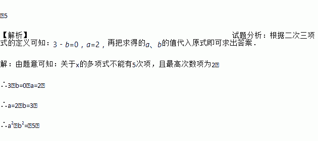 ﹣5 【解析】试题分析:根据二次三项式的定义可知:3﹣b=0,a=2,再把求得的a、b的值代入原式即可求出答案. 【解析】 由题意可知:关于x的多项式不能有5次项,且最高次数项为2, ∴3﹣b=0,a=2, ∴a=2,b=3, ∴a2﹣b2=﹣5.