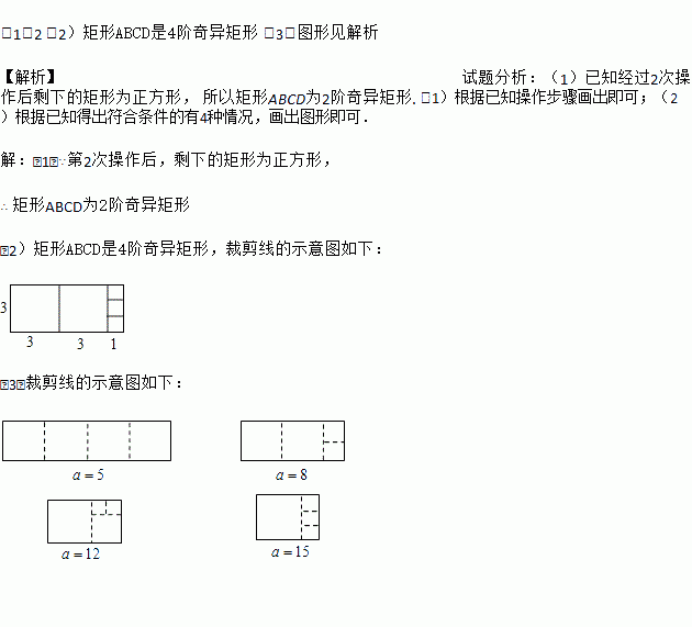 (3)已知矩形ABCD的一边长为20,另一边长为a(a<20),且它是3阶奇异矩形,请画出矩形ABCD及裁剪线的示意图,并在图的下方直接写出a的值.