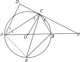 分析 (1)由AC平分∠DAB得∠1=∠2,加上∠2=∠3,则∠1=∠3,于是可判断OC∥AD,由于AD⊥DC,所以OC⊥DC,则可根据切线的判定定理得到PD是⊙O的切线;