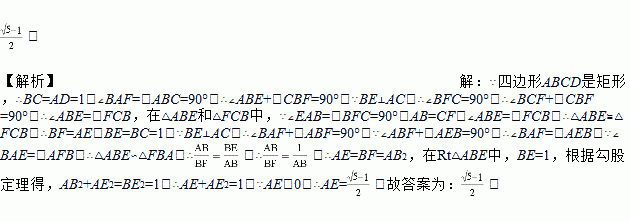 (2017山东省莱芜市)如图,在矩形ABCD中,BE⊥AC分别交AC、AD于点F、E,若AD=1,AB=CF,则AE=______.