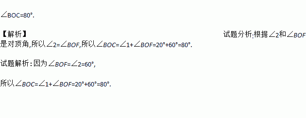 如图所示,AB,CD,EF交于点O,∠1=20°,∠2=60°,求∠BOC的度数.