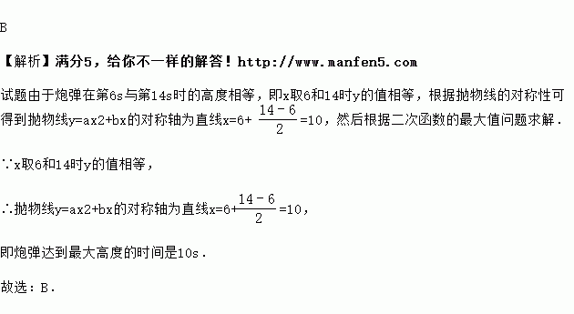 发射一枚炮弹,经过x秒后炮弹的高度为y米,x,y满足y=ax2+bx,其中a,b是常数,且a≠0.若此炮弹在第6秒与第14秒时的高度相等,则炮弹达到最大高度的时刻是( )