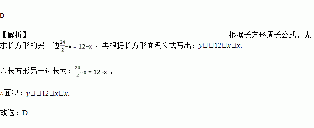 长方形的周长为24cm,其中一边长为xcm(其中x>0),面积为ycm2,则这个长方形中y与x的关系可以写为( )