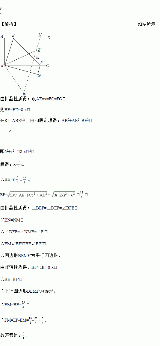 已知,如图,矩形ABCD边AB=6,BC=8,再沿EF折叠,使D点与B点重合,C点的对应点为G,将△BEF绕着点B顺时针旋转,旋转角为a(0°<a<180°),记旋转这程中的三角形为△BE′F′,在旋转过程中设直线E′F′与射钱EF、射线ED分别交于点M、N,当EN=MN时,则FM的长为_____.
