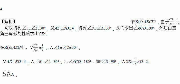 如图所示,已知∠1=∠2,AD=BD=4,CE⊥AD,2CE=AC,那么CD的长是( )