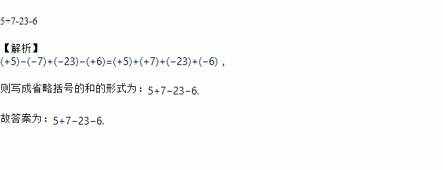 把(+5)﹣(﹣7)+(﹣23)﹣(+6)写成省略括号的和的形式为________