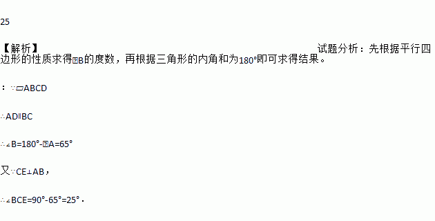 如图,?ABCD中,CE⊥AB,垂足为E,如果∠A=115°,则∠BCE=________度.