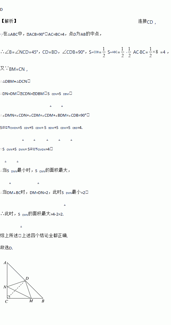 D ¡¾½âÎö¡¿Á¬½ÓCD£¬ ¡ßÔÚ¡÷ABCÖУ¬¡ÏACB=90¡ã£¬AC=BC=4£¬µãDΪABµÄÖе㣬 ¡à¡ÏB=¡ÏNCD=45¡ã£¬CD=BD£¬¡ÏCDB=90¡ã£¬S¡÷CDB=S¡÷ABC=¡¤AC¡¤BC==4 £¬ ÓÖ¡ßBM=CN£¬ ¡à¡÷DBM¡Õ¡÷DCN£¬ ¡àDN=DM£¬¡ÏCDN=¡ÏDBM£¬S¡÷CDN=S¡÷DBM£¬ ¡à¡ÏDMN=¡ÏCDN+¡ÏCDM=¡ÏCDM+¡ÏBDM=¡ÏCD...