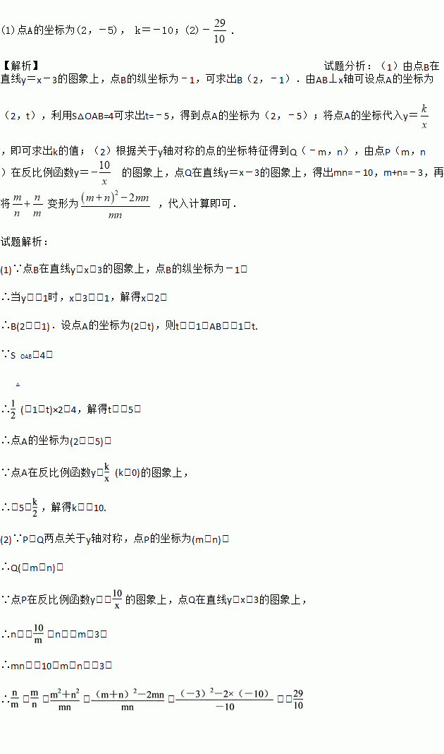 (k<0)的图象上,点B,Q在直线y=x-3的图象上,点B的纵坐标为-1,AB⊥x轴,且S△OAB=4,若P,Q两点关于y轴对称,设点P的坐标为(m,n).