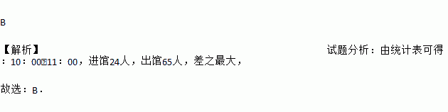 B 【解析】试题分析:由统计表可得:10:00﹣11:00,进馆24人,出馆65人,差之最大, 故选:B.