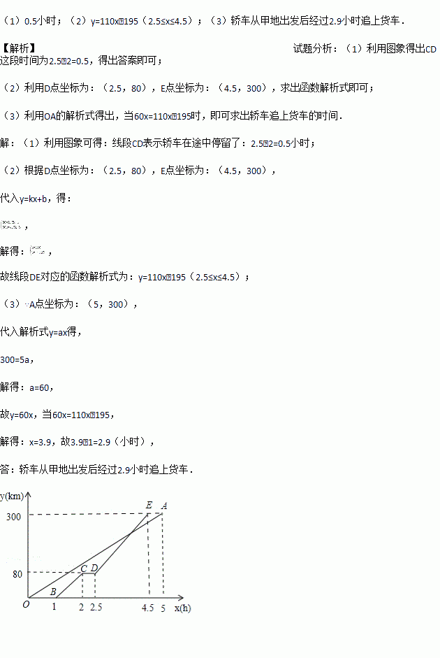 甲、乙两地距离300km,一辆货车和一辆轿车先后从甲地出发驶向乙地.如图,线段OA表示货车离甲地的距离y(km)与时间x(h)之间的函数关系,折线BCDE表示轿车离甲地的距离y(km)与时间x(h)之间的函数关系,根据图象,解答下列问题: