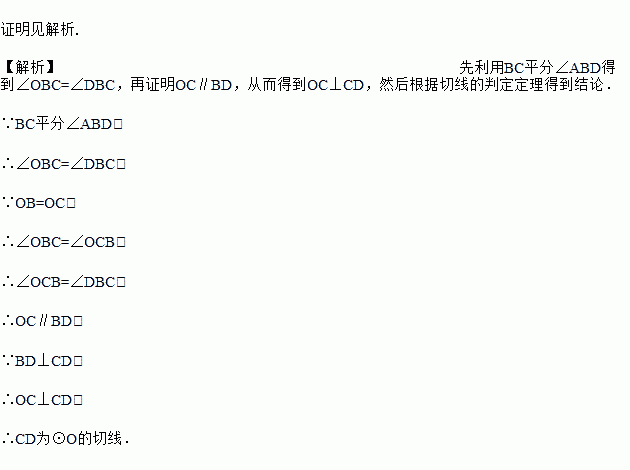 如图所示,AB是⊙O的直径,点C为⊙O上一点,过点B作BD⊥CD,垂足为点D,连结BC.BC平分∠ABD.