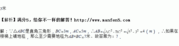 如图所示,一段楼梯,高BC是3 m,斜边AC是5 m,如果在楼梯上铺地毯,那么至少需要地毯________.