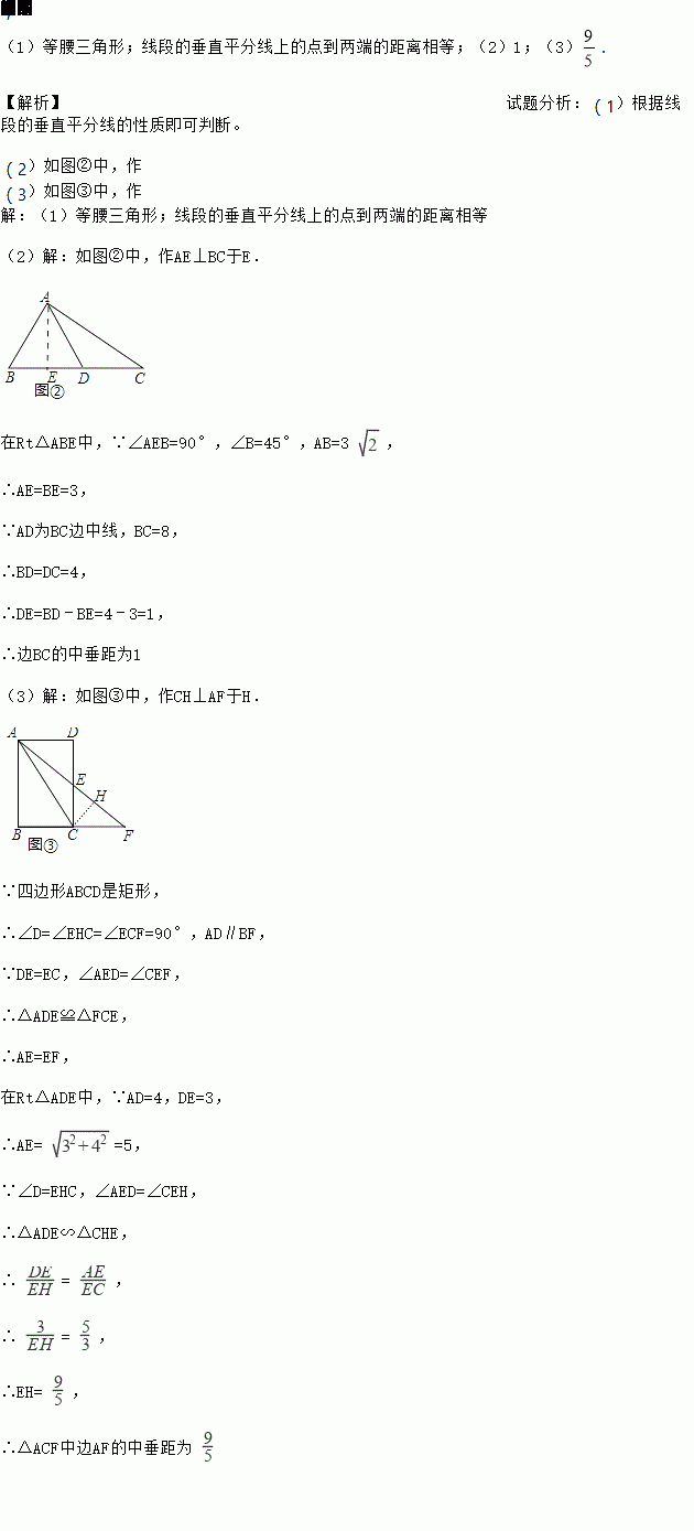 (3)如图③,在矩形ABCD中,AB=6,AD=4.点E为边CD的中点,连结AE并延长交BC的延长线于点F,连结AC.求△ACF中边AF的中垂距.