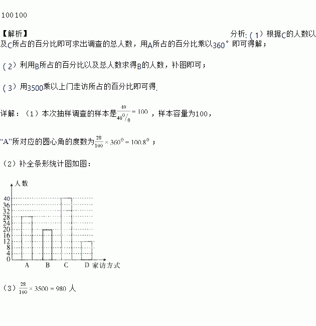 (3)已知该县共有3500位老师参与了这次“万师访万家”活动,请估计该县共有多少位老师采用的是上门走访的方式进行家访的?