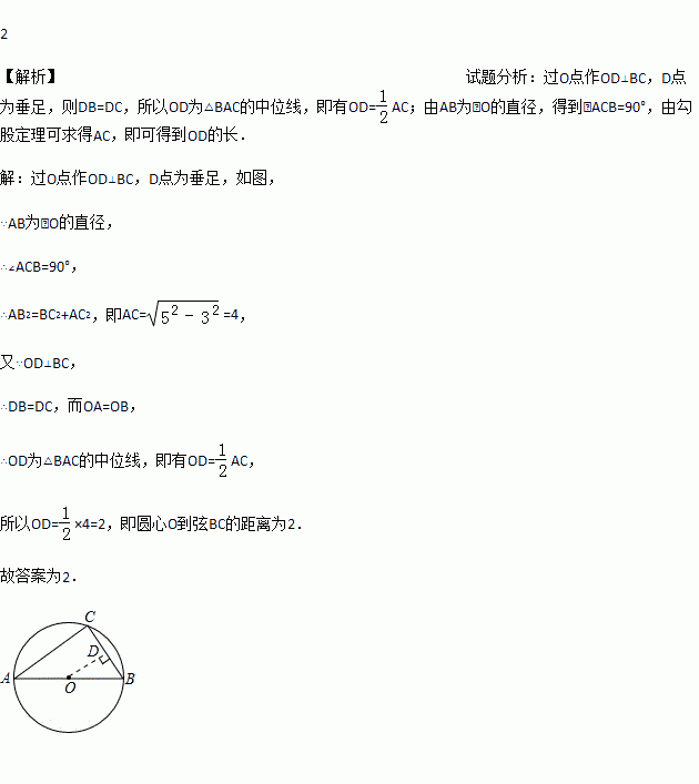 如图,C是以AB为直径的⊙O上一点,已知AB=5,BC=3,则圆心O到弦BC的距离是 .
