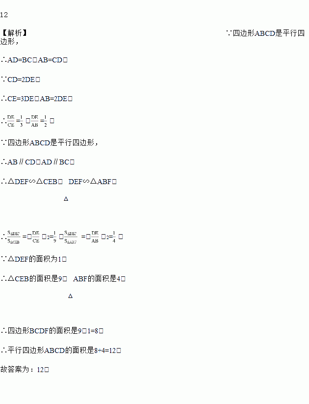 如图,?ABCD中,E是CD的延长线上一点,BE与AD交于点F,CD=2DE.若△DEF的面积为1,则?ABCD的面积为_____.