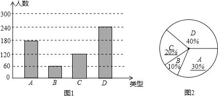 分析 (1)根据D类型的人数是240人,所占的比例是40%,据此即可求得总人数;